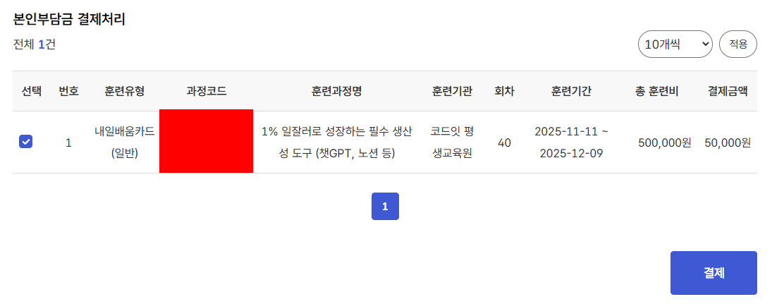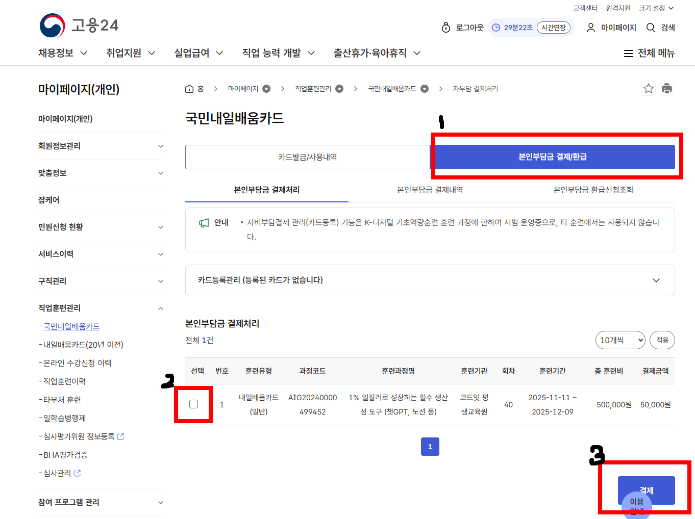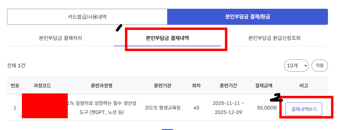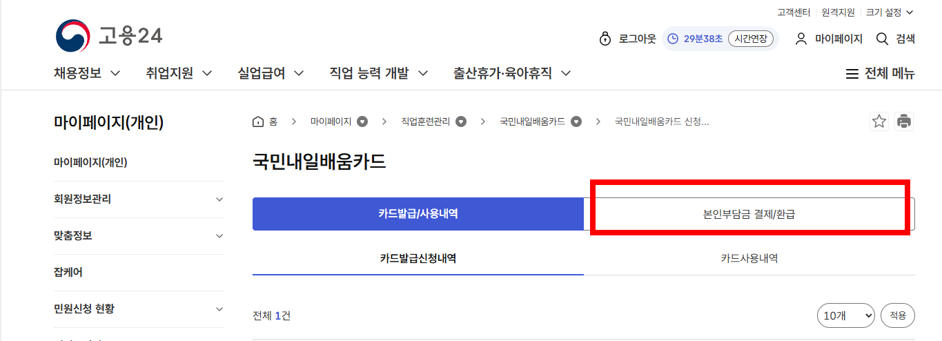 3. 국민내일배움카드- 본인부담금 결제/환급 클릭