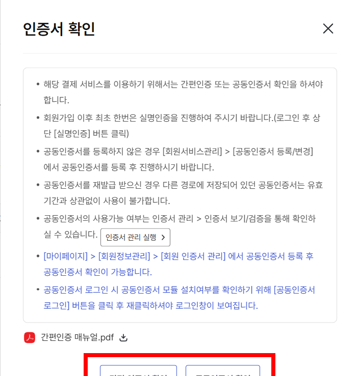 끝까지 안내려져서 안보이긴 한데 왼쪽은 간편인증서, 오른쪽은 공인인증서