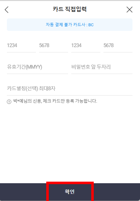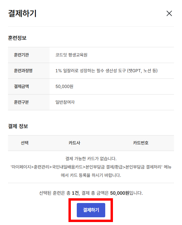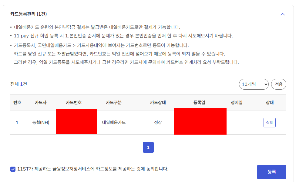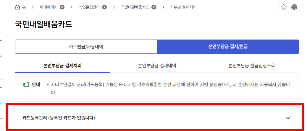 *카드등록누르고 카드 직접입력(내일배움카드 신청한 카드로) 작성하고 확인