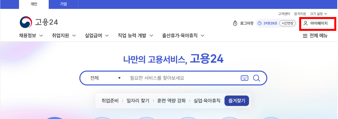 1.고용24 로그인하고 마이페이지 클릭.