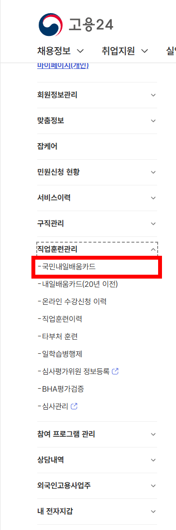2.직업훈련관리에서 국민내일배움카드 클릭.