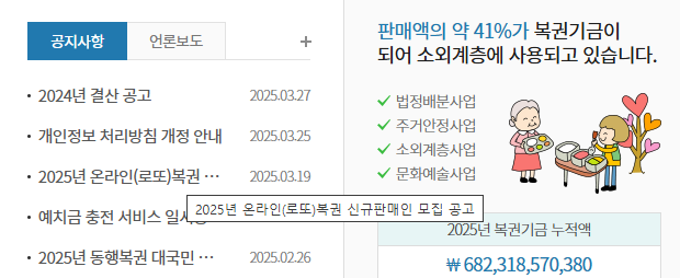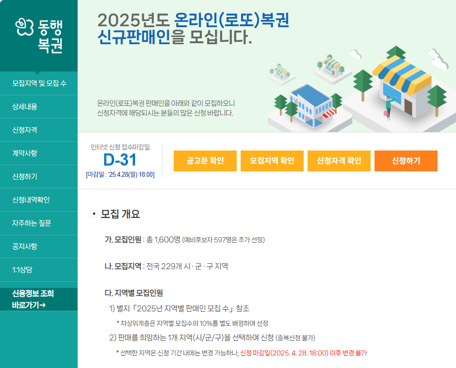 --> 2025년도 온라인(로또)복권 신규판매인을 모십니다. 온라인(로또)복권 판매인을 아래와 같이 모집하오니 신청자격에 해당되시는 분들의 많은 신청 바랍니다. 인터넷 신청 접수마감일 D-31 [마